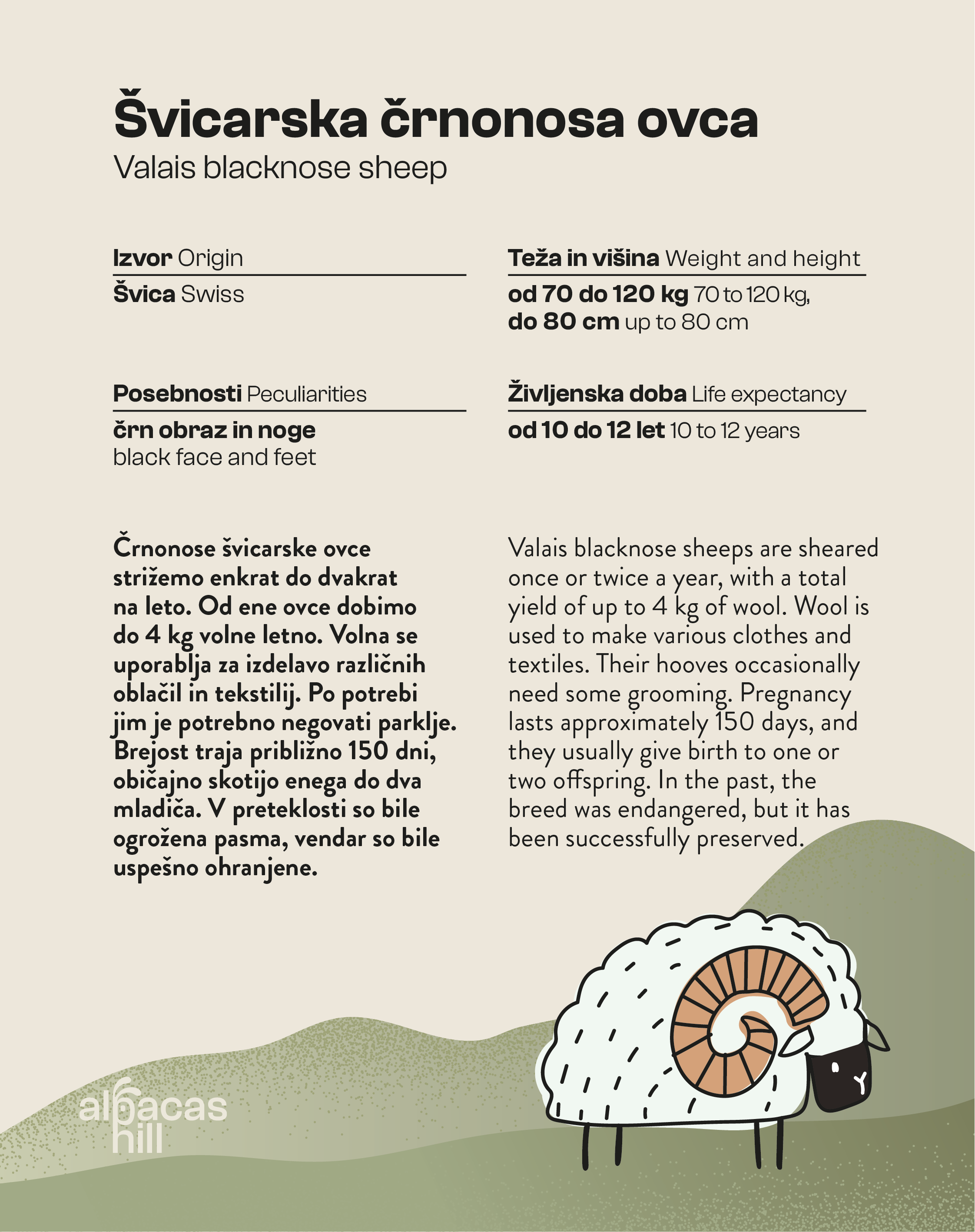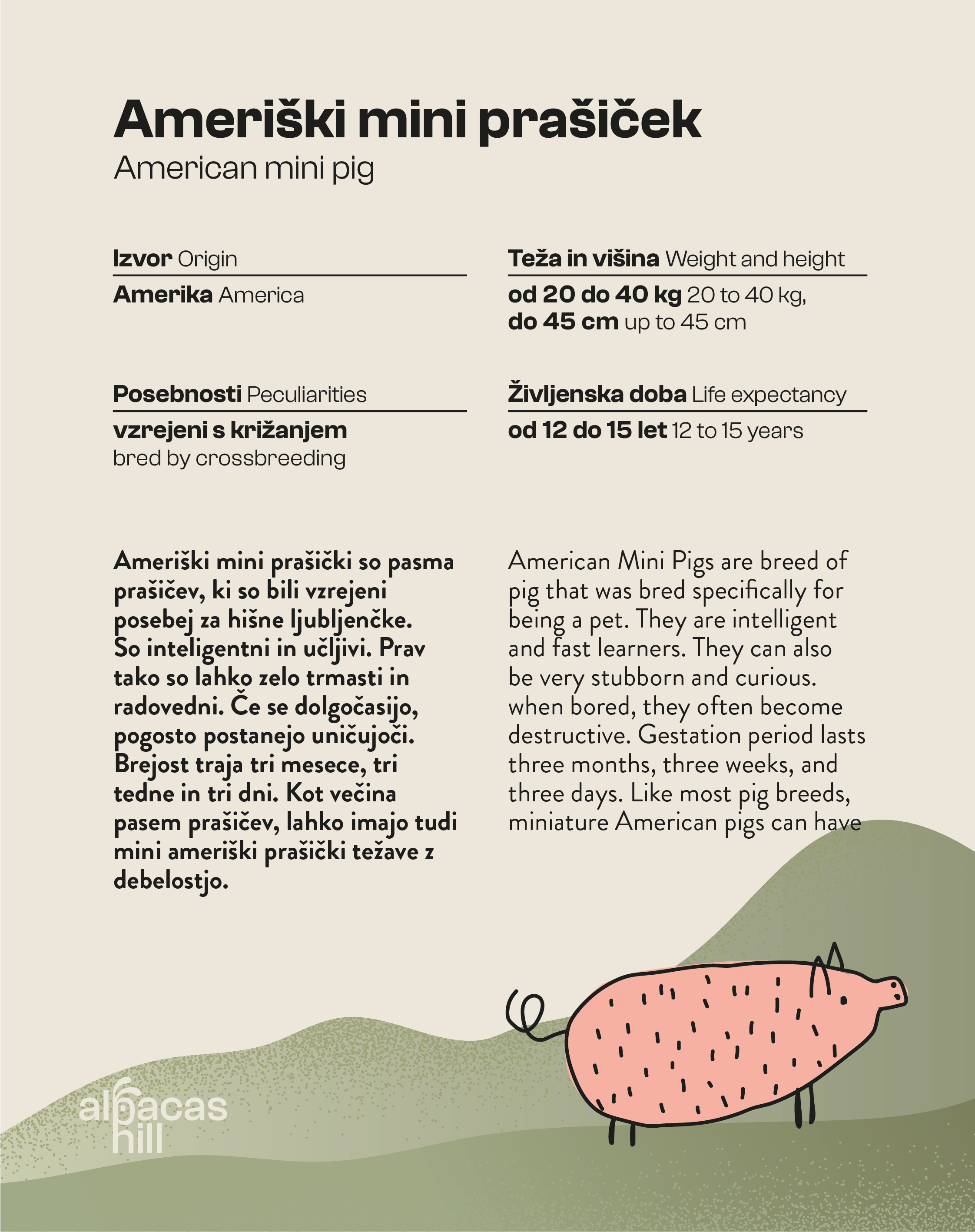 Oblikovali smo info table, ki naj bi bile postavljene ob ogrado vsake živali. Zgoraj so primeri info table za alpake, črnonose švicarske ovce in ameriške mini prašičke.