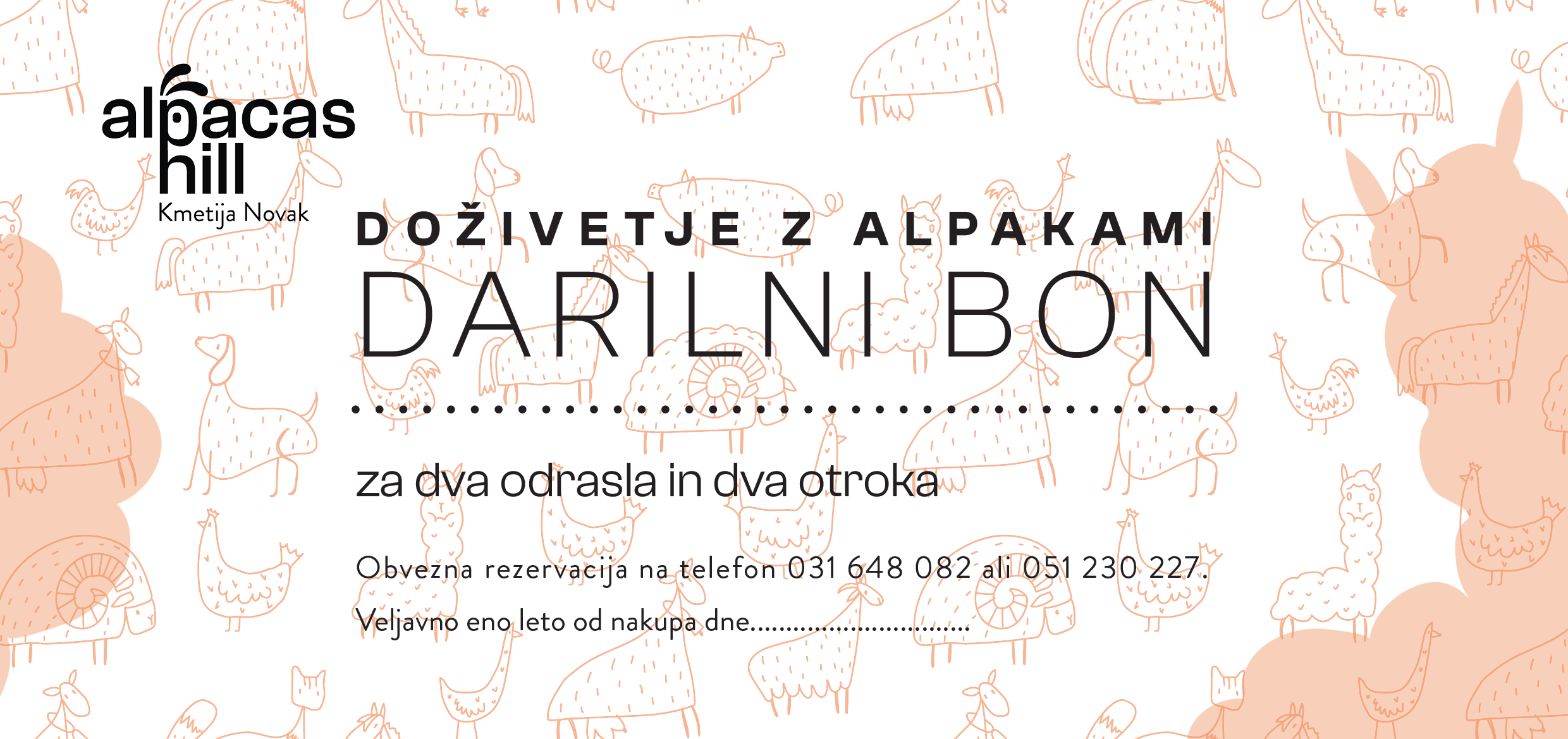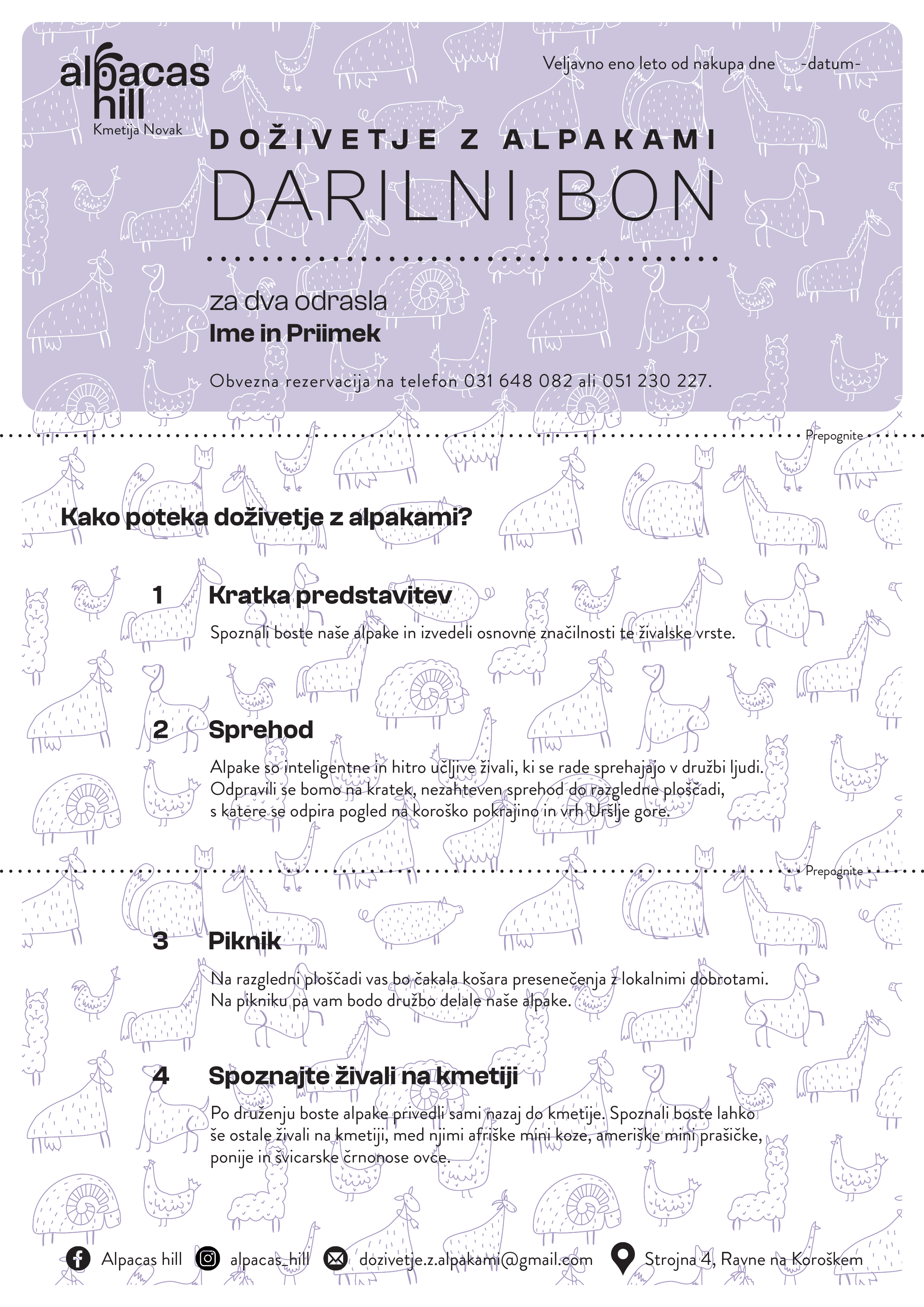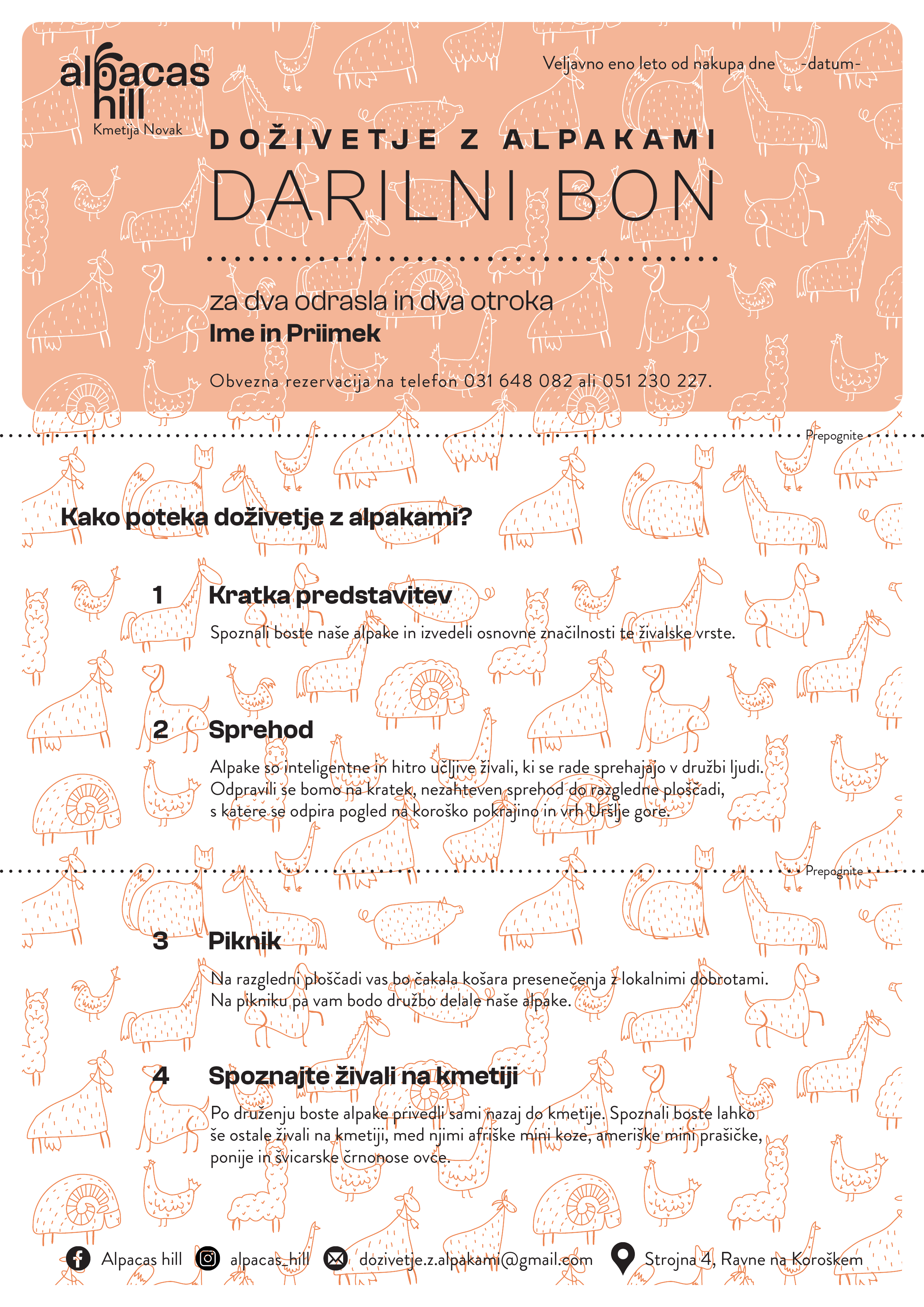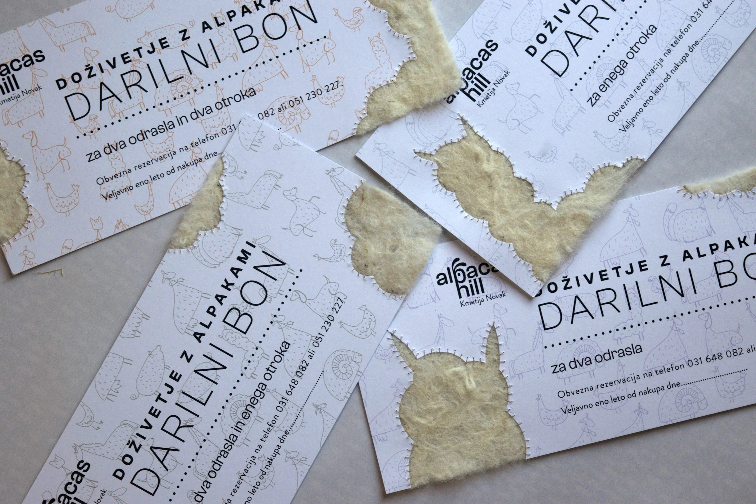 V preteklosti so bili digitalni darilni boni Alpacas hill v velikosti 210x100mm. Pomanjkljivost tega je bila, da so ljudje bon natisnili, niso pa odrezali odvečnega papirja. Iz tega razloga smo bone spremenili v velikost A4, da jih lahko obiskovalci natisnejo, zložijo in pospravijo v kuverto.